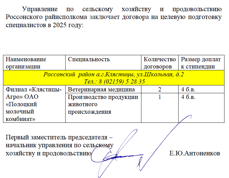 Управление по сельскому хозяйству и продовольствию Полоцкого райисполкома заключает договора о целевой подготовке специалистов: