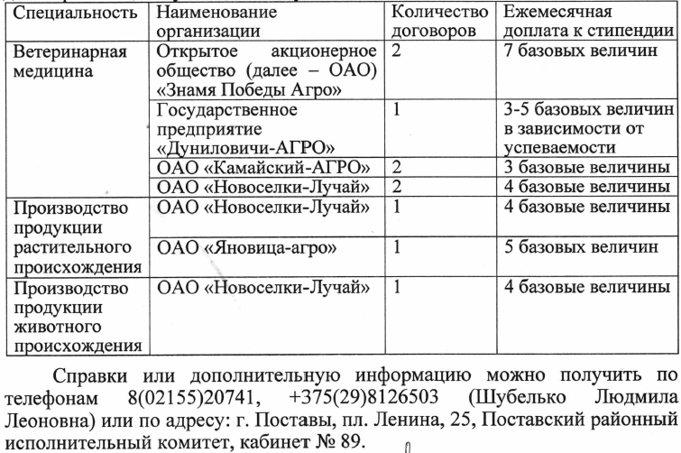 Управление по сельскому хозяйству и продовольствию Поставского районного исполнительного комитета заключает договора на целевую подготовку специалистов: